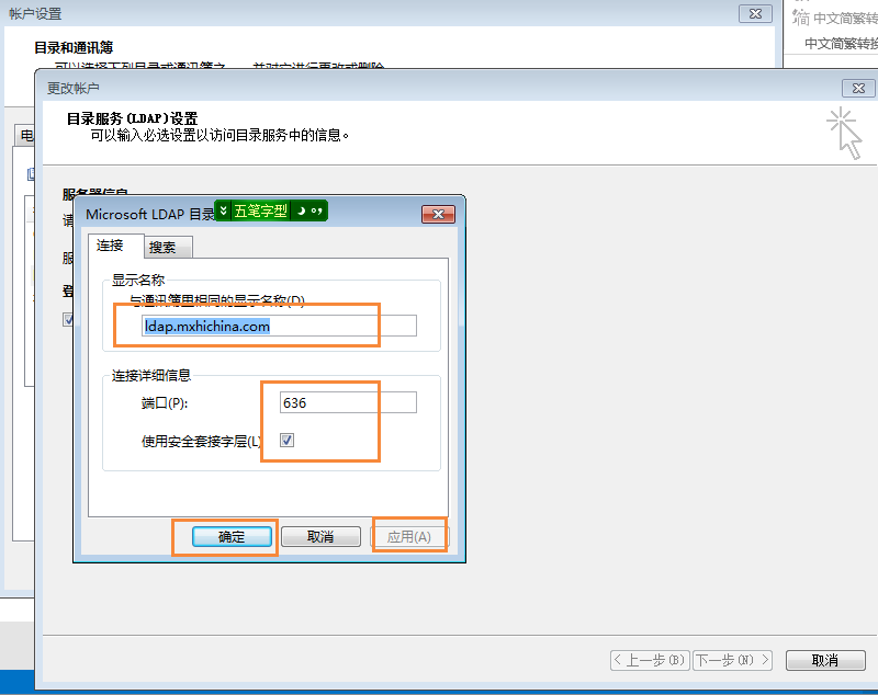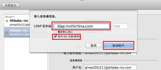 Ldap服务器:ldap.mxhichina.com;端口636;使用SSL链接