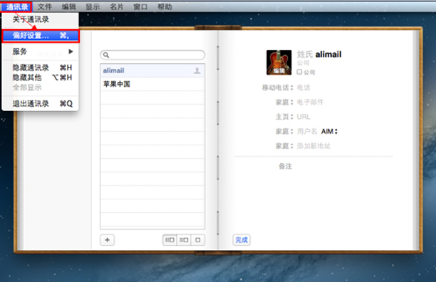 (一)点击桌面上的“通讯簿”端,点击“通讯录”-> “偏好设置”